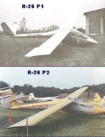 The structure of the first prototype, the R-26 P1, was similar to that of the R-23 Gébics. The Frise-type ailerons had unusually small area. The front part of the fuselage was covered with light metal sheets as on the Mokány. The landing gear consisted of a spring suspended fixed gear located behind the c.g. of the empty glider, and a nose skid streamlined into the fuselage's bottom. The tail unit had all-flying V surfaces with mass balancing. On the trailing edges of the control surfaces Flettner-type tabs were fitted. To maintain the structural integrity of the wings bat-like airbrakes were fitted on the sides of the fuselage under the wings. This prototype first flew at May 6, 1960.