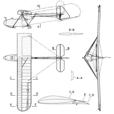 The fuselage consisted of a gondola with an open cockpit, and a rectangular shaped aft-beam supporting the tail unit. The canopy with a windshield opened up forward. The gondola consisted of a strong keel and frame, longerons and a steel tube strut supporting the aft-beam. The gondola around the seat was covered by plywood, the other parts by canvas. The landing gear consisted of a skid under the gondola, a fixed wheel located behind the c.g., and a small aft skid made of spring-steel. Standard instrumentation was of a speedometer and a variometer. There was room on the instrument panel to fit in an altimeter as well.