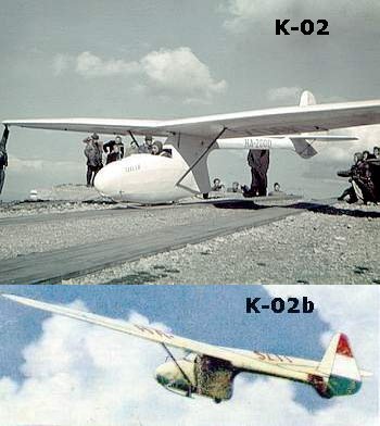The development work was done mostly by György Mező, Gábor Jereb and József Zappel. Among the applied refinements the barcing cables were omitted, an airbrake of Rubik type and a fixed wheel behind the c.g. were fitted. The new version got the designation of K-02b. The prototype of this version first flew at August 20, 1950. The drawings for the serial production were prepared jointly by the design bureau of the Hungarian Aeronautical Association and design section of the Sportárutermelő Vállalat, Esztergom. Altogether 89 serial examples were built by the Sportárutermelő Vállalat. The type was used by student pilots up to the middle of 60s to gain the siver badge.
