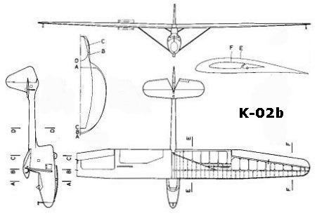 The glider was high-wing "pod-and-boom" design. The center part of the wing had a rectangular palnform and the outer panels petered off to rounded wingtips. The strutted wing had one main spar and a diagonal secondary spar at the inner part as well as a parallel one at the 70% of the chord.. The wing was covered by plywood in front of the main spar and by fabric behind it. On the K-02 there was no airbrake fitted due to the anticipated small landing speed. However the K-02b version had a Rubik type airbrake. The ailerons were of Frise type.